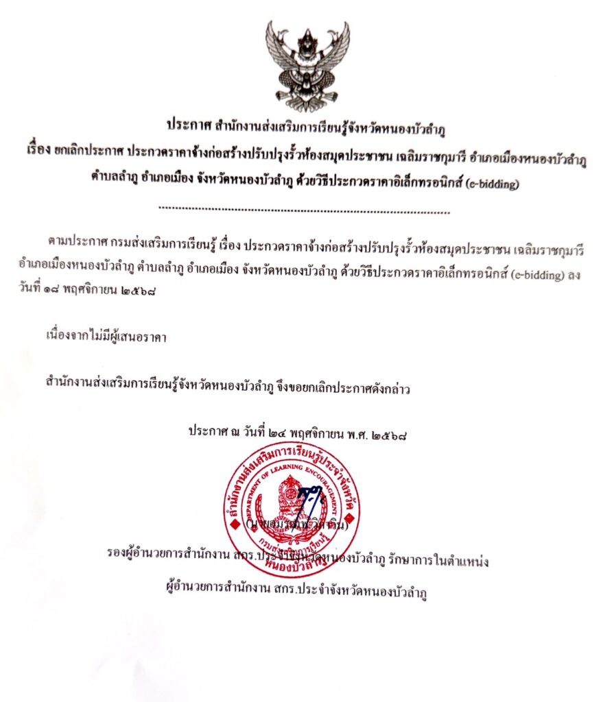 เรื่อง ยกเลิกประกาศ ประกวดราคาจ้างก่อสร้างปรับปรุงรั้วห้องสมุดประชาชน “เฉลิมราชกุมารี” อำเภอเมืองหนองบัวลำภู