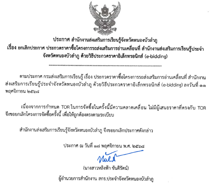 ประกาศสำนักงาน สกร.ประจำจังหวัดหนองบัวลำภู ประกาศสำนักงาน สกร.ประจำจังหวัดหนองบัวลำภู 19/11/2025 admin เรื่อง ยกเลิกประกวดราคาซื้อโครงการรถส่งเสริมการอ่านเคลื่อนที่